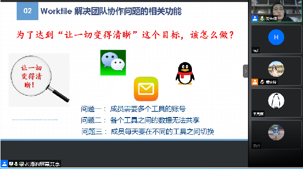 梁老师在活动开始时指导老师体验了 “腾讯文档”的多人实时协作功能。紧接着梁老师从团队协作过程中遇到的具体问题入手,结合个人工作实践及高校老师在开会、毕业论文指导、学生实习指导等工作中遇到的问题,向老师演示了Worktile在具体应用场景中如何解决团队沟通协作中遇到的困难。Worktile是企业级项目协作与目标管理工具,可以加强团队成员之间协作与沟通,使团队任务协作过程中的一切都变得清晰。梁老师理论与实操相结合,参训教师互动积极,交流热烈。 通过此次培训,老师们了解并体验了可以使团队协作变得高效的小工具,同时也深刻认识到信息技术可以为个人的生活、学习以及工作带来的便利。