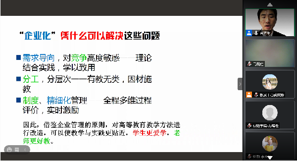 “企业化课堂”教学法,把课堂当成企业来经营,运用企业管理的先进原则(需求导向,高竞争,高激励,高团队)辅以教学理念的融合(自主学习、精细化管理),从而获得满意的教学效果。曹海生老师首先分享了他在课堂中通过制定明确的、令人心动的学习目标以及学习内容的模块化可选择进行需求导向以及利用六维一体的评价方式实现高激励来提高学生学习的积极性,获得满意的教学效果。曹老师还分享了他潜移默化、润物无声的“融入式(践行式)思政”。会后我校教师就教学中的经验以及遇到的困惑与难题与曹老师进行了深入交流。 这次的分享对我校教师的教学设计有一定的借鉴与启发,也更加深刻体会到作为一名高校老师的责任与使命。此次培训我校60多位老师参与了在线分享交流。