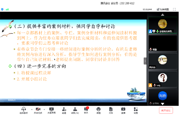 彭锻炼老师为大家一一列举了 “腾讯会议+学习通平台”的优劣势、操作小技巧及网上教学的启示,他认为直播教学最重要的优势是可以师生直接互通,双向提问无时差,老师能较客观及时地掌握学生的学习情况,调整上课的进度,但是对网络环境要求较高,不是所有学生都能参与。他建议提高网络教学质量的前提是建设好题库、提供丰富的案例材料供学生学习和讨论,为学生营造一个虚拟的上课环境,以便让学生能更好投入到课堂中。