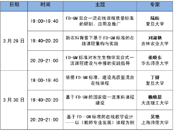为进一步促进我校教师在线课程建设,保障在线教学质量,我校教师教学发展中心作为上海地方高校教学发展联盟(筹)发起成员积极推广在线课程质量标准,3月29日-30日FD-QM高等教育在线课程质量标准联盟联合上海师范大学、上海地方高校教学发展联盟(筹)组织开展高质量的“标准引领下的优质在线课程设计与实践”为主题的公益直播培训。现将有关安排通知如下: